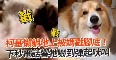 柯基懶躺地上被媽戳腳底 下秒電話響它嚇到彈起吠叫