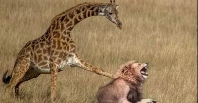 長頸鹿媽媽踢獅子頭並殺死它以拯救她的孩子,野生動物的嚴酷生活